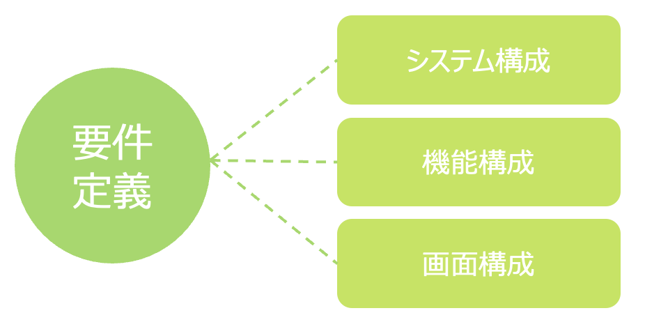 要件定義では、企画で立案された計画から具体的なシステム構成や機能構成、画面構成を検討していきます。
