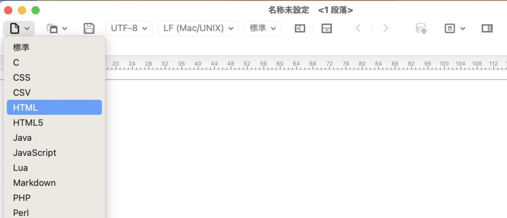miを開いて、左上のノートマークから自分が書くコード(今回はHTML)を選択します。